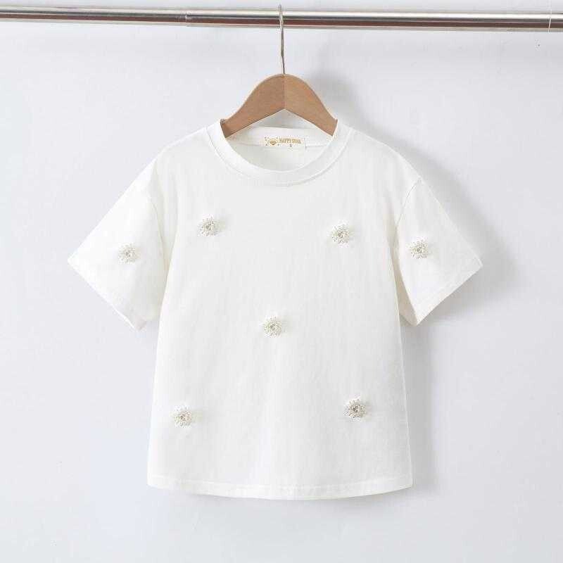 Stijlvol meisjes T-shirt met korte mouwen en kleine bloemen in reliëf met pareldetails.