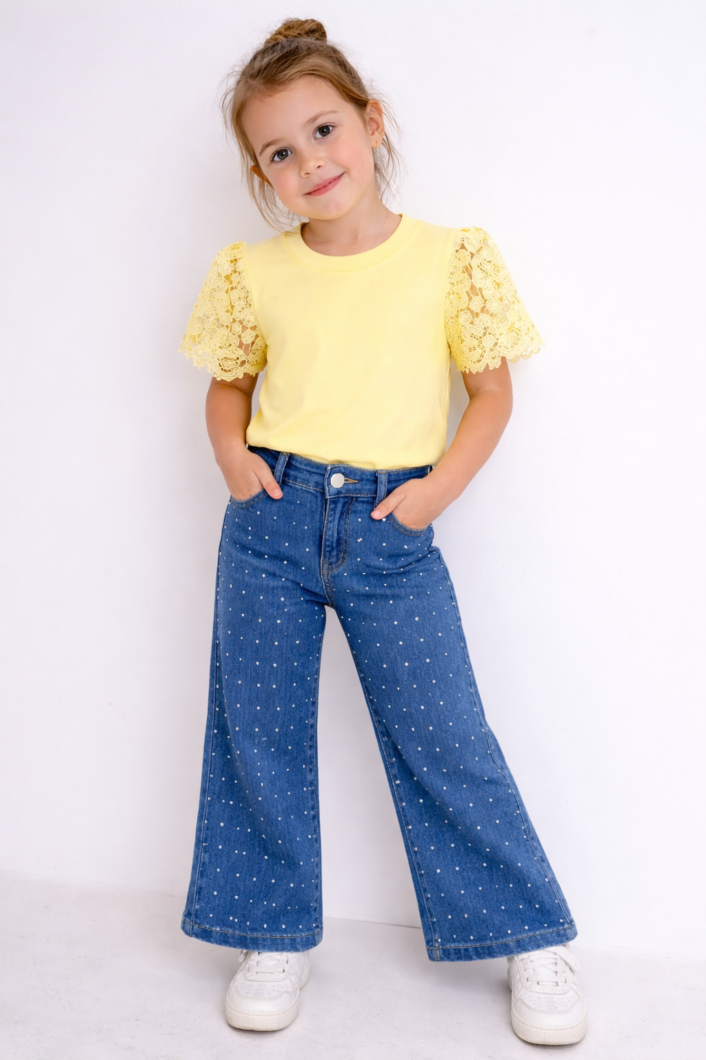 Meisjes T-shirt met korte mouwen, kanten details met pailletten, comfortabele stof, moderne stijl en makkelijk te combineren.