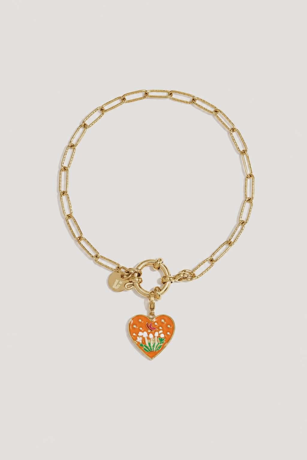 Een subtiele, goudkleurige armbandenset met een bedeltje met oranje en tulpen ๐ท